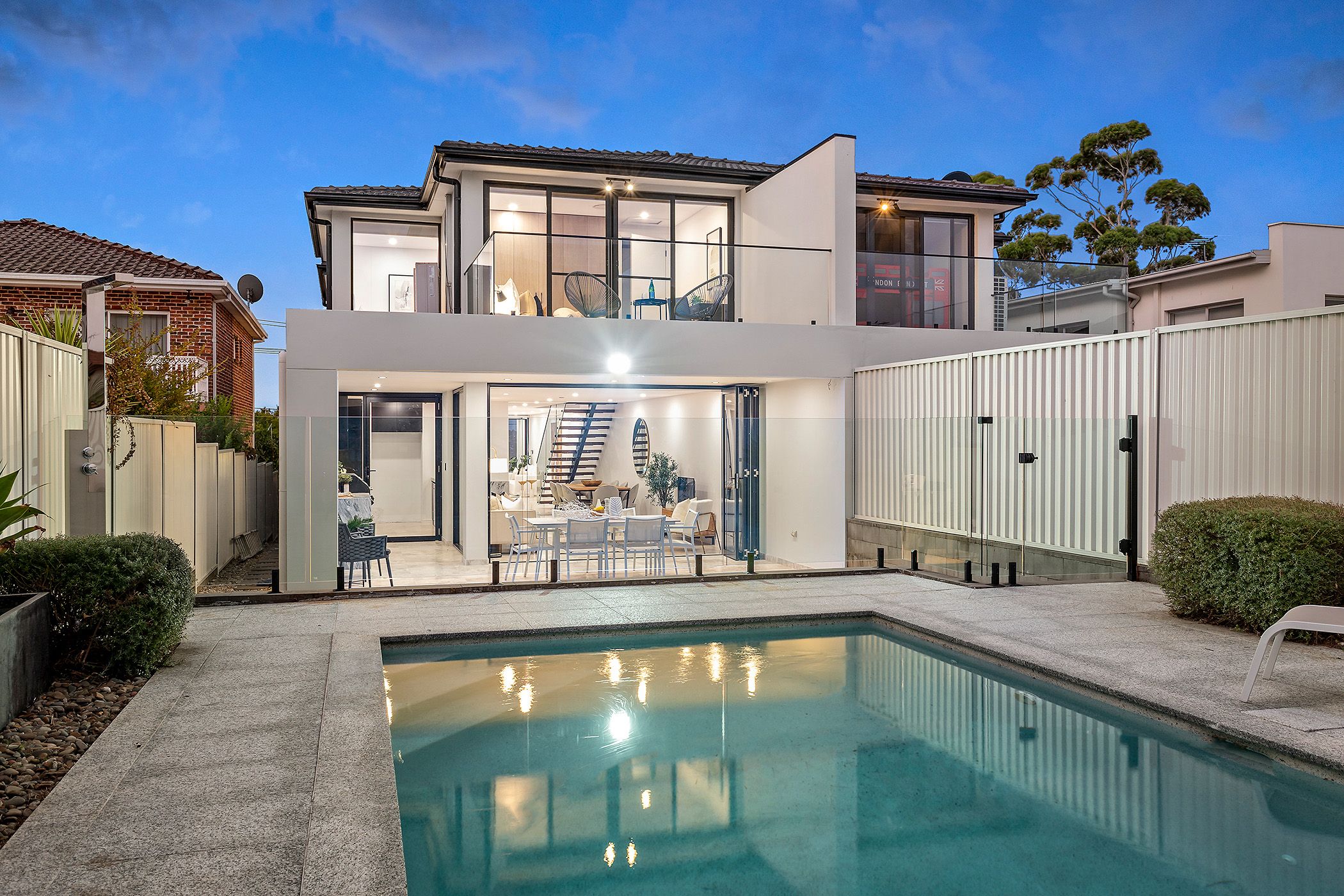 The bright home has been stylishly designed throughout and features level access from the main living area to a sheltered BBQ patio and private garden, where there is a luxury inground swimming pool and paved poolside patio. A second living space opens onto a covered front terrace plus there is an upper-level balcony, both commanding an all-encompassing backdrop of the Georges River.