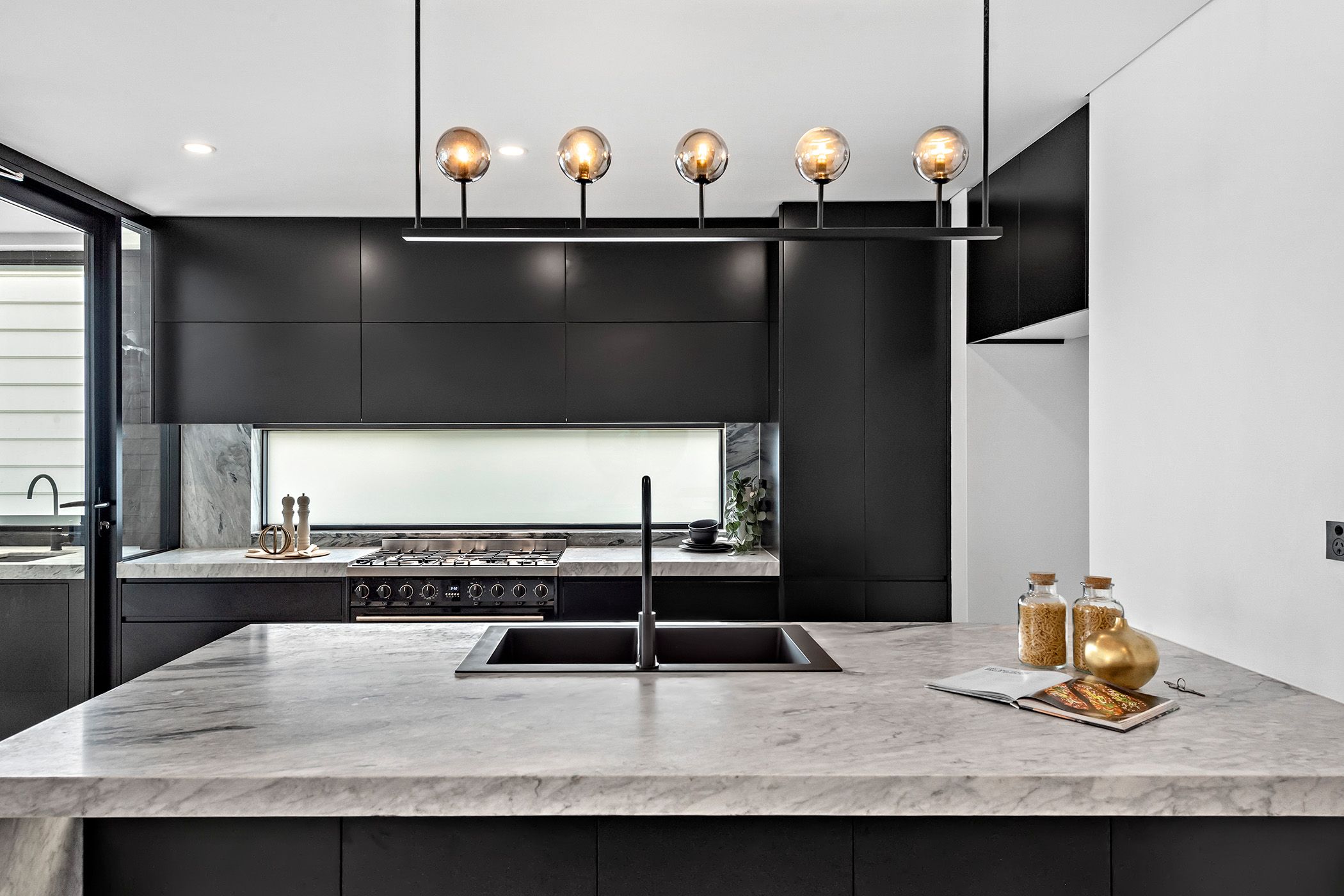 Deluxe stone kitchen with breakfast bar and integrated gas appliances
