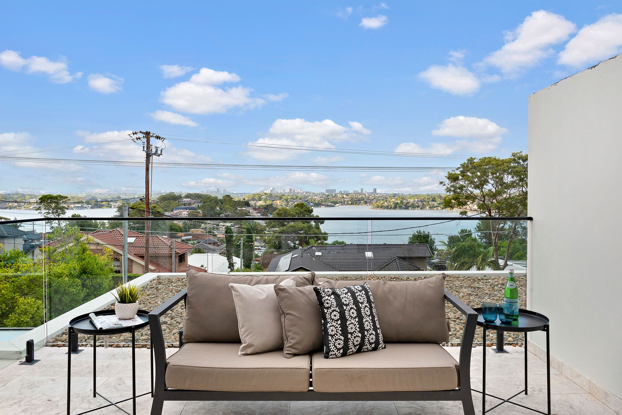 Wide upper-level balcony that captures sweeping views over the water