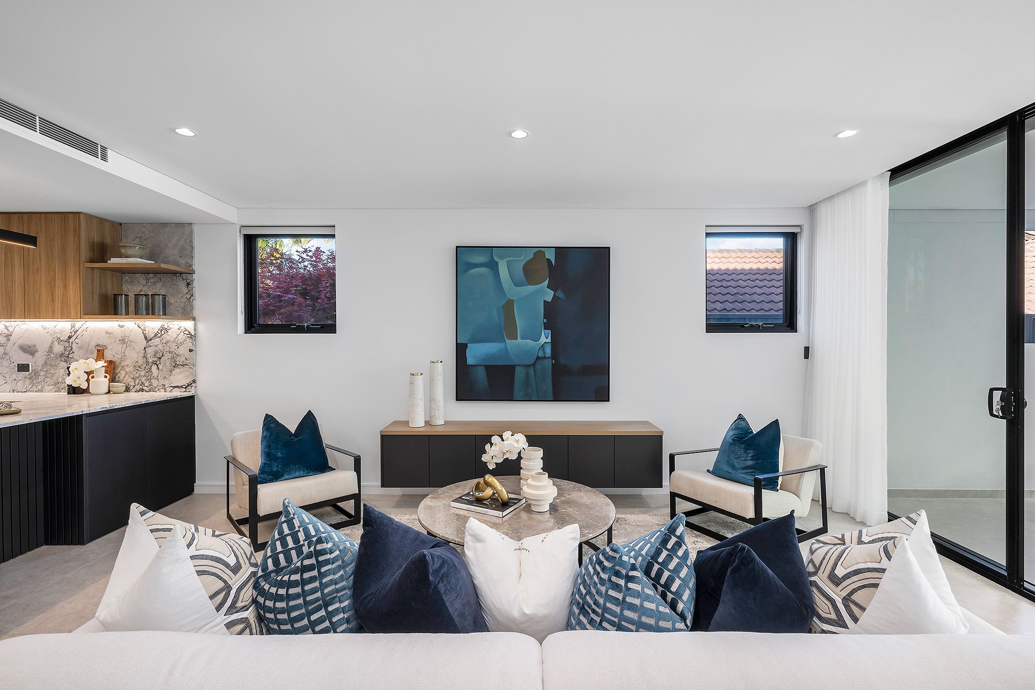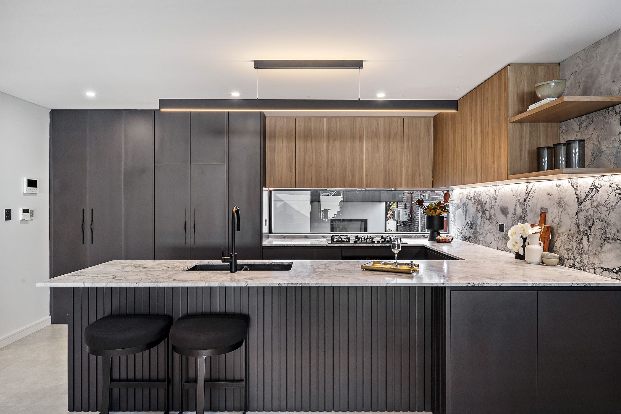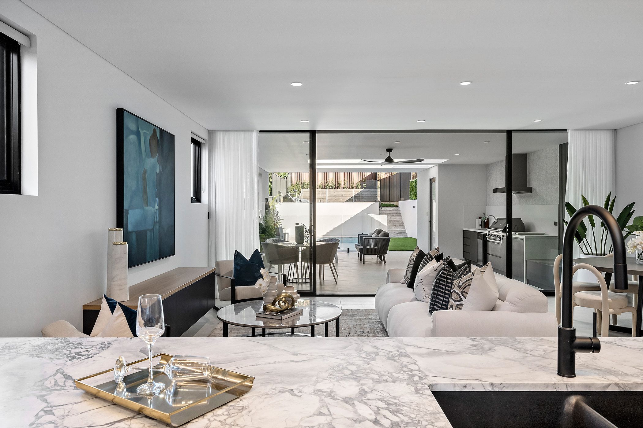- Chef's kitchen with marble breakfast bench and high-end appliances