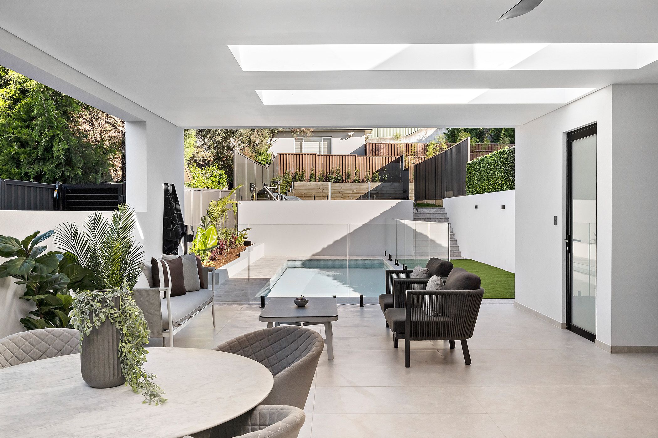 The home has a striking street presence that's boldly modern, but inside it's been designed for family comfort and easy living with an emphasis on entertaining. These flowing interiors are bright and airy throughout and feature a generous open layout and a seamless connection to a covered dining patio overlooking an inground swimming pool.