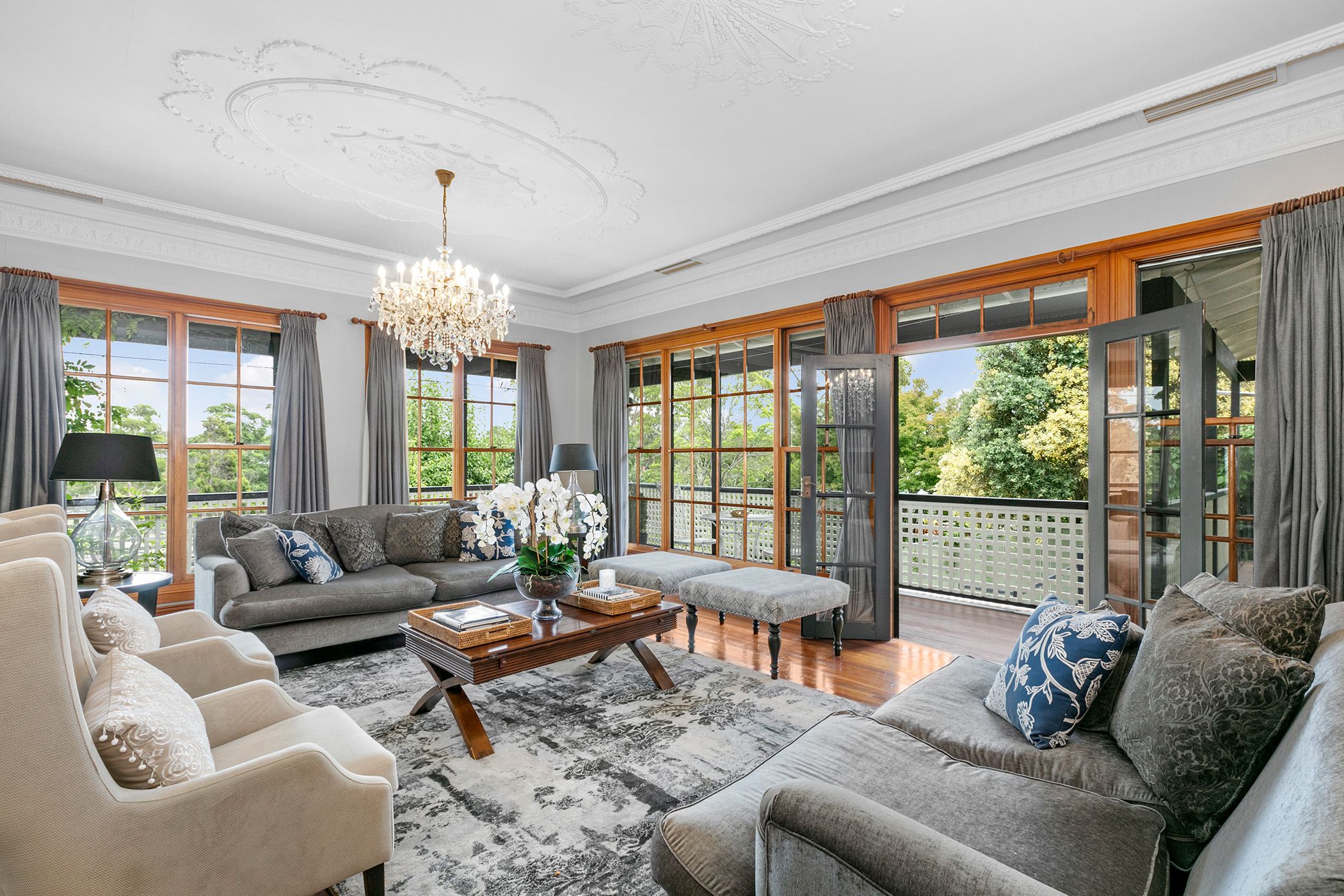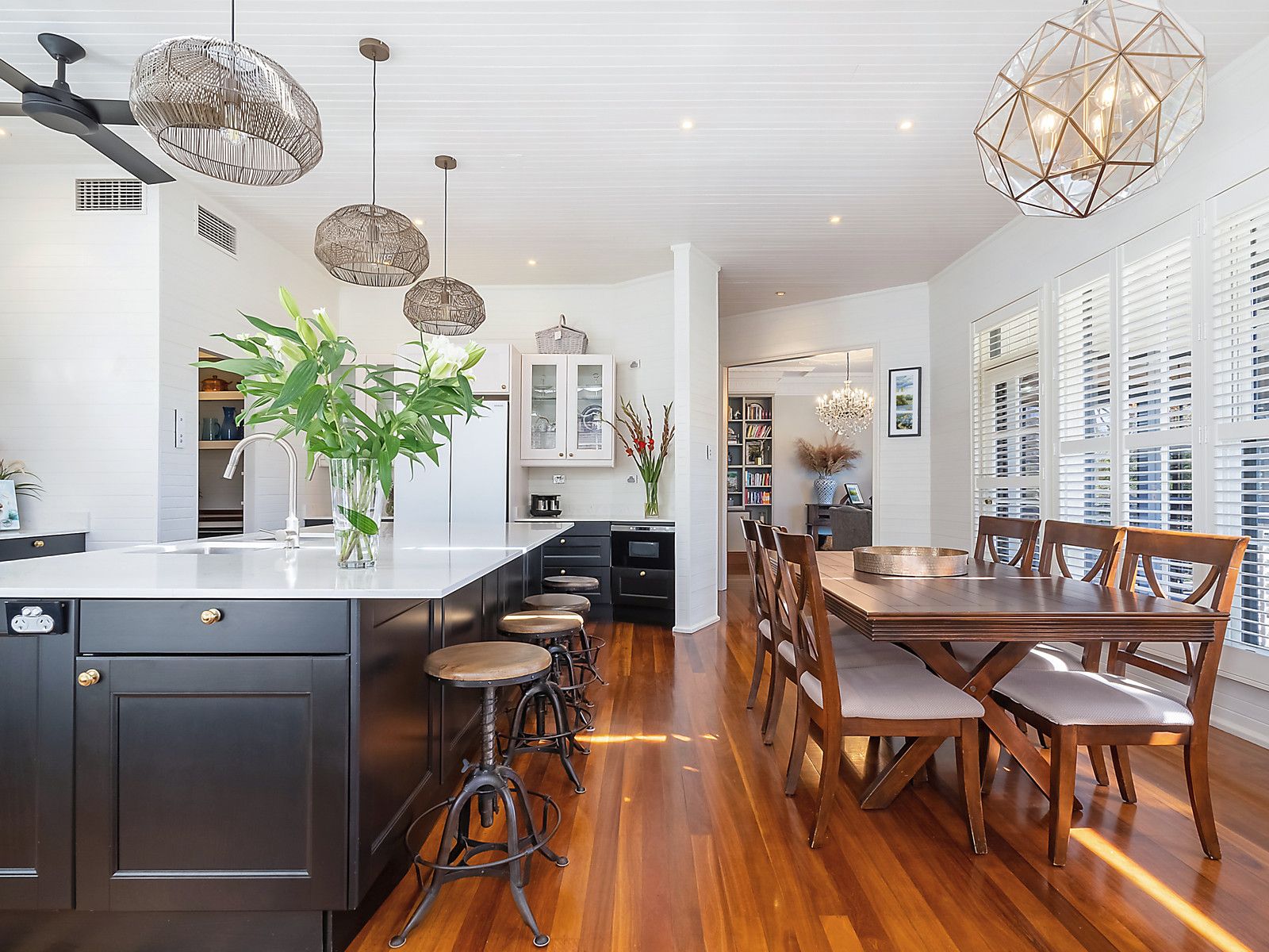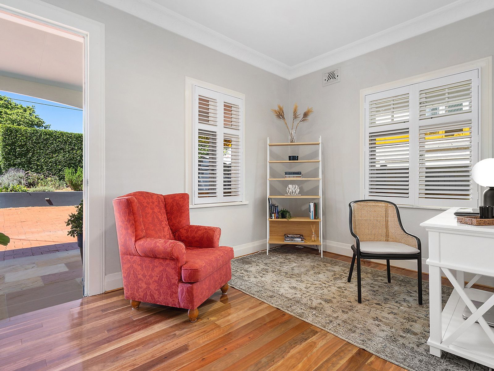 - Elegant spotted gum floors, intricate cornices, and stylish plantation shutters