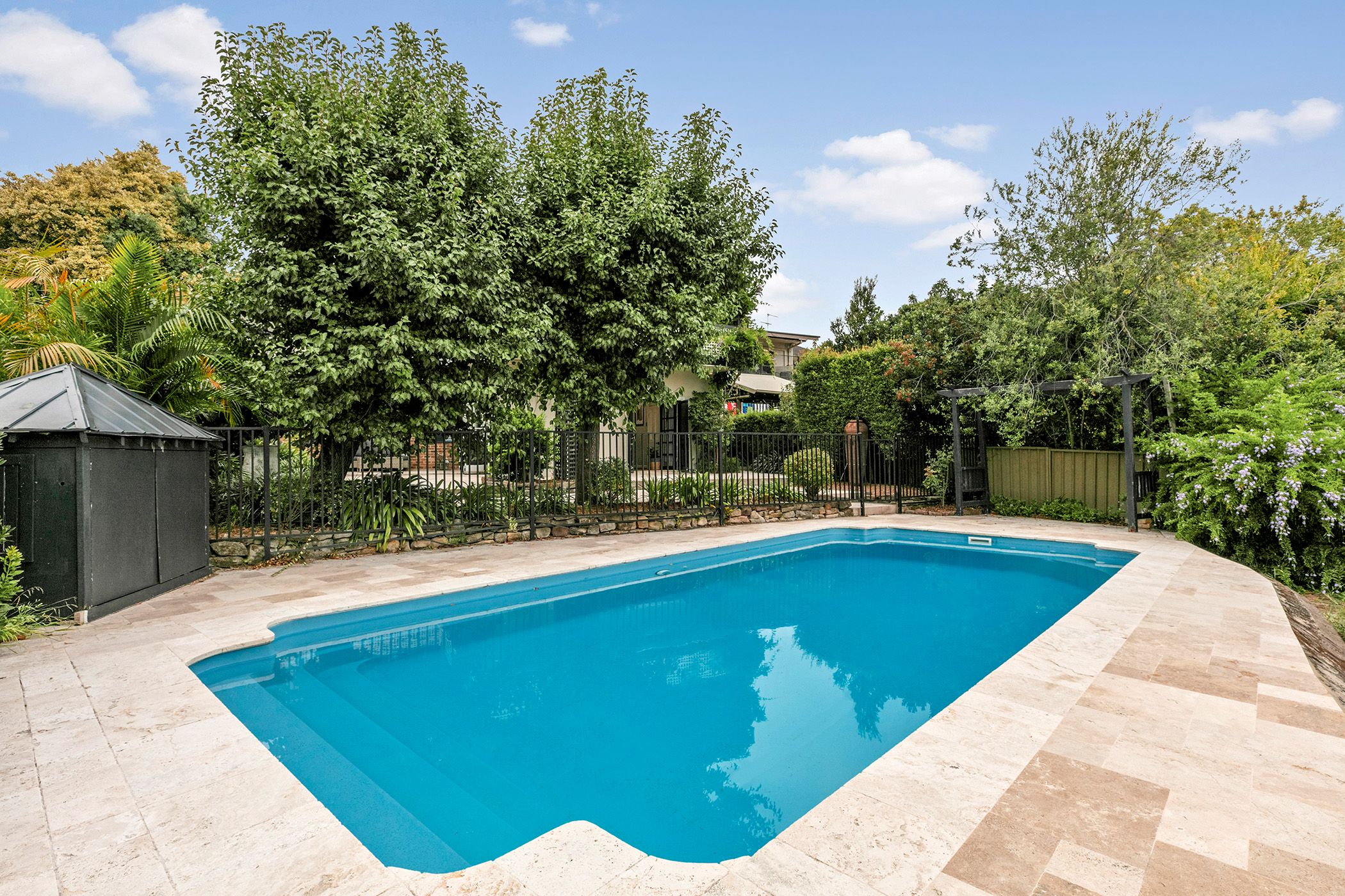 - Additional side courtyard, complete with a solar heated pool and lush fruit trees