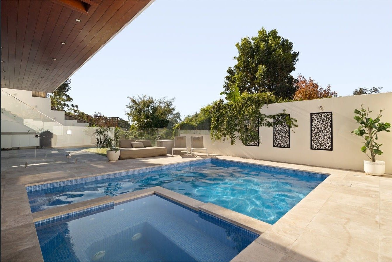 Resort-Style Pool & Spa – Gas-heated saltwater pool with swim jets and a 10-person spa, all smart-controlled for effortless enjoyment.