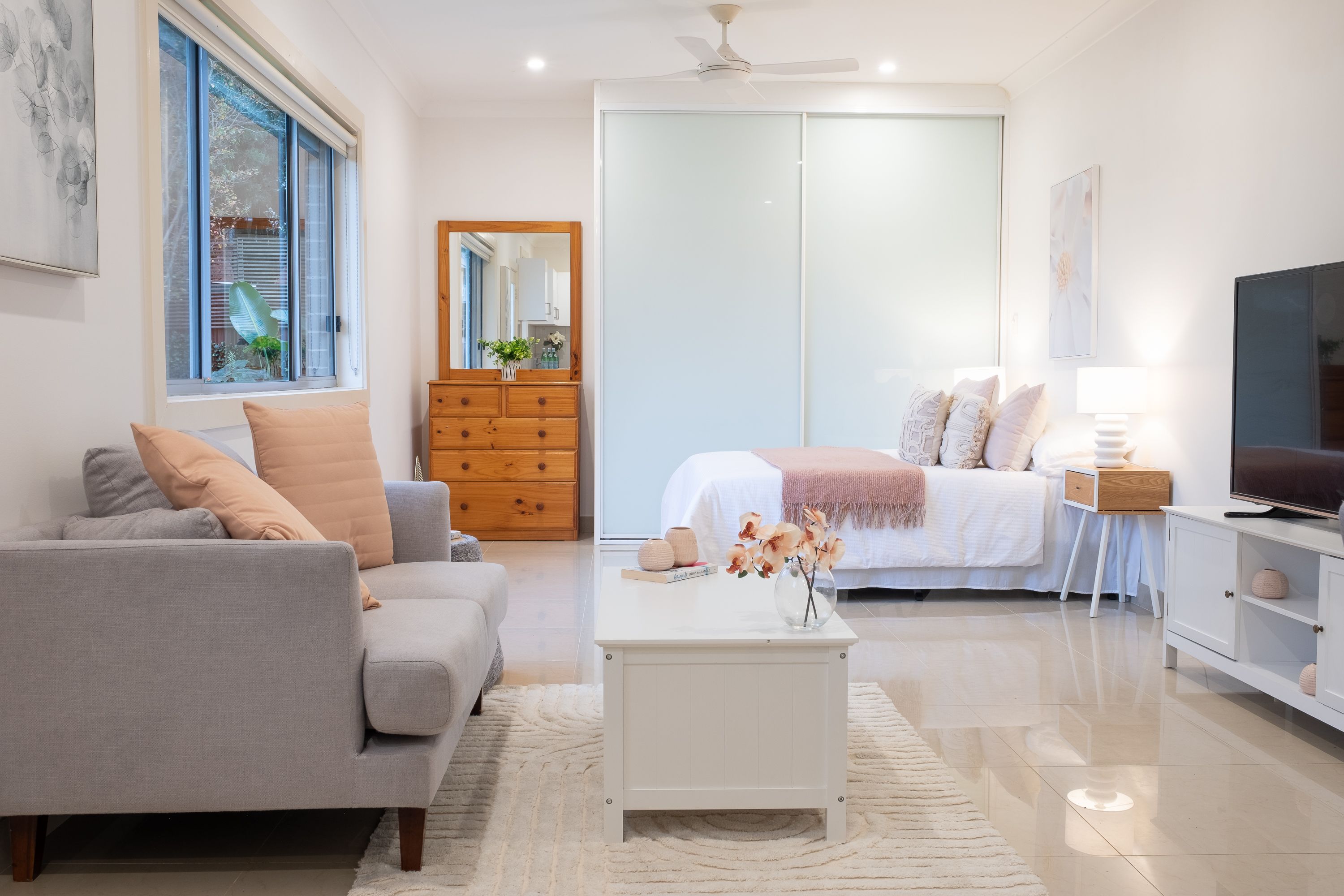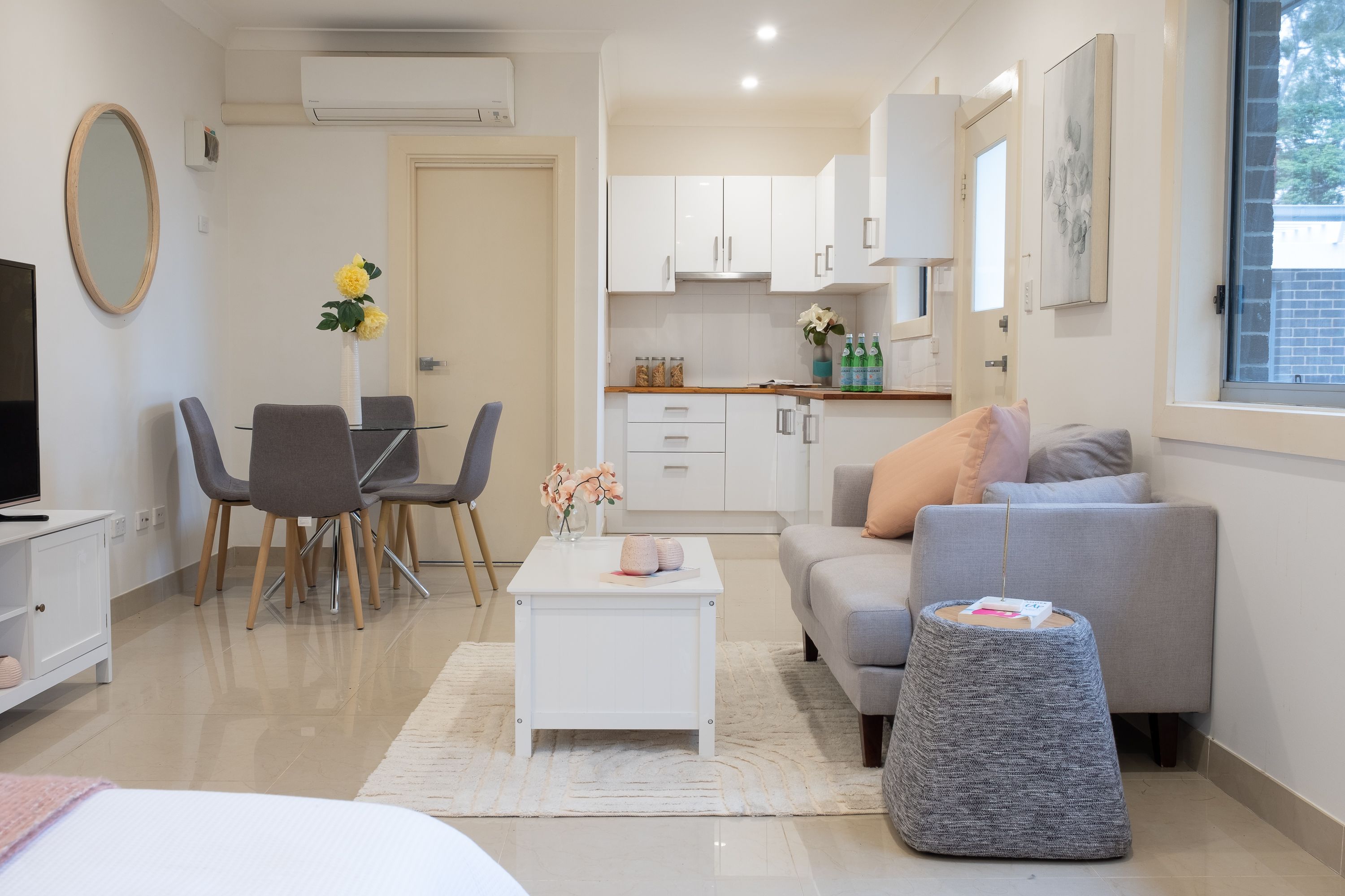- Large laundry with built in cupboards and external access