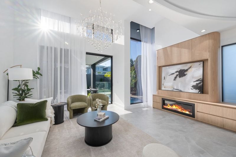 The luxe kitchen is a chef's dream, complete with stone benchtops, a gas cooker, and an integrated side-by-side fridge. A walk-in pantry provides ample storage, while the open-plan living area is enhanced by a fireplace, creating an inviting ambiance year-round. Each bedroom boasts its own private ensuite, ensuring comfort and privacy for the entire family. The main suite is a sanctuary, featuring a spacious walk-in robe, private balcony, and a lavish ensuite with a deep soaking bathtub.