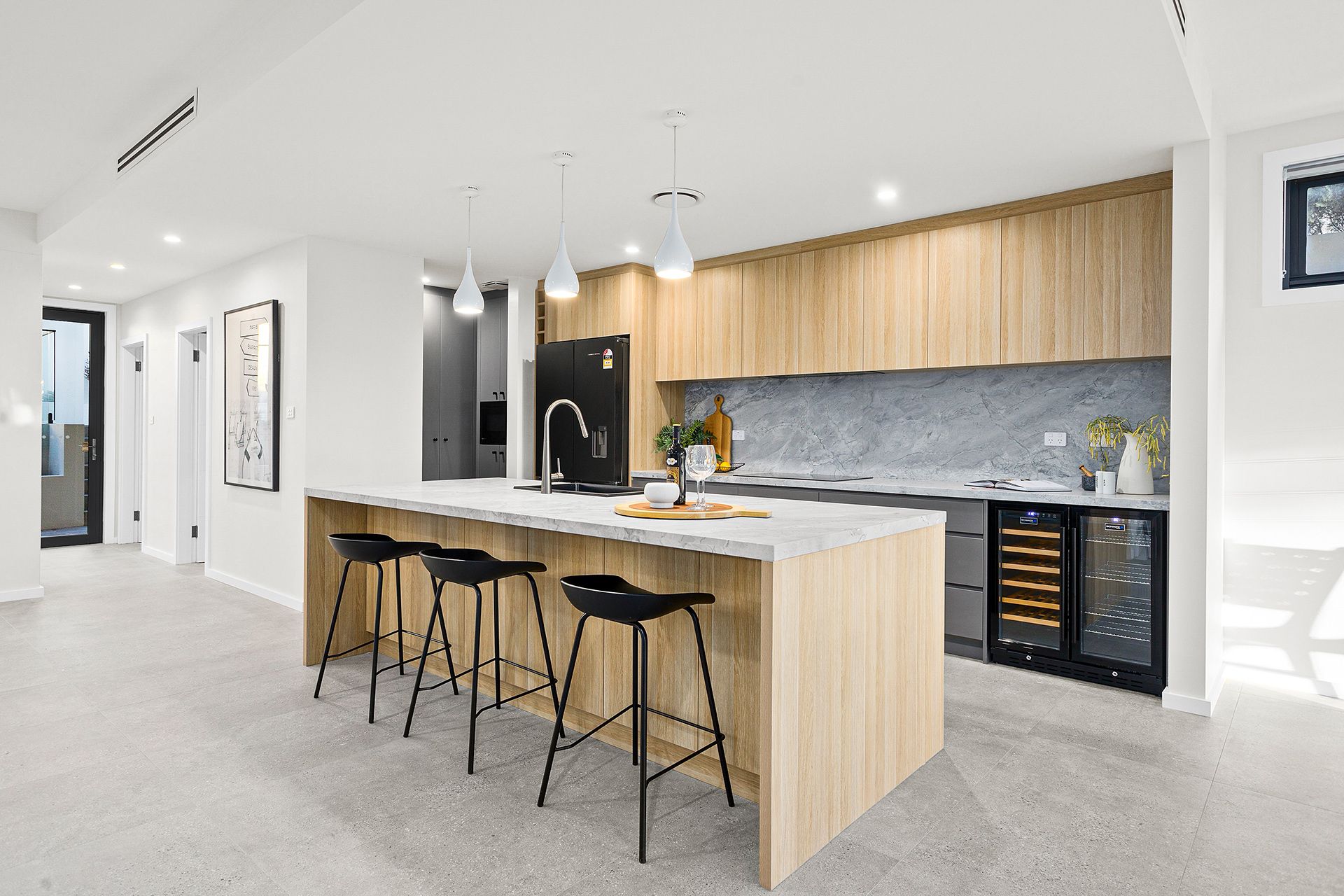 * Ultra-modern kitchen with stunning premium Brazilian dolomite stone bench-tops, quad door fridge, bar fridge, and high-end appliances