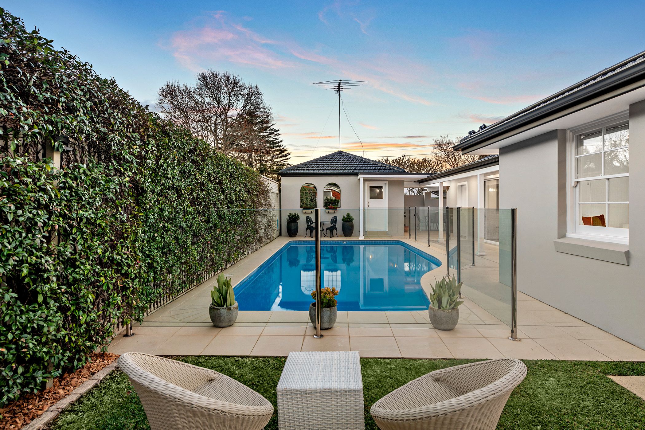 - Large Sundrenched north facing covered alfresco patio, swimming pool and private garden