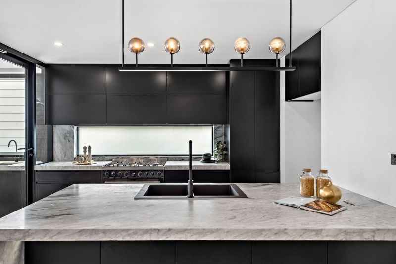- Contemporary island kitchen with stone finishes and quality fittings