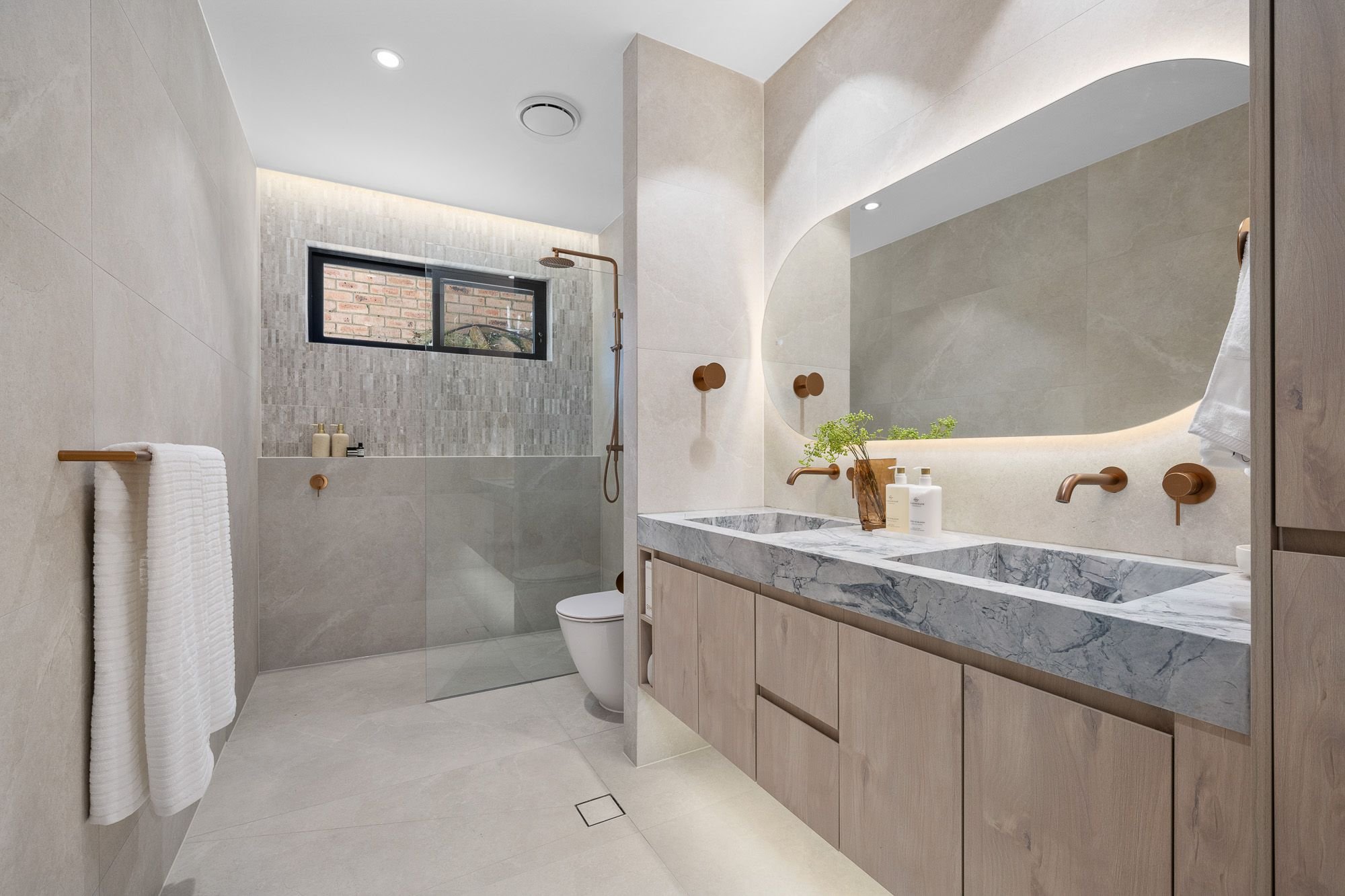 Interiors are immaculately presented and feature a great separation of living areas with a formal lounge area, casual open family space and a seamless connection to the outside. A large entertainers' kitchen has high-end stone benchtops, a breakfast island and walk-in butler's pantry, plus there is a downstairs guest bathroom. All bedrooms have built-in wardrobes, including the master that has a walk-in robe, ensuite and wide terrace with leafy neighbourhood views.